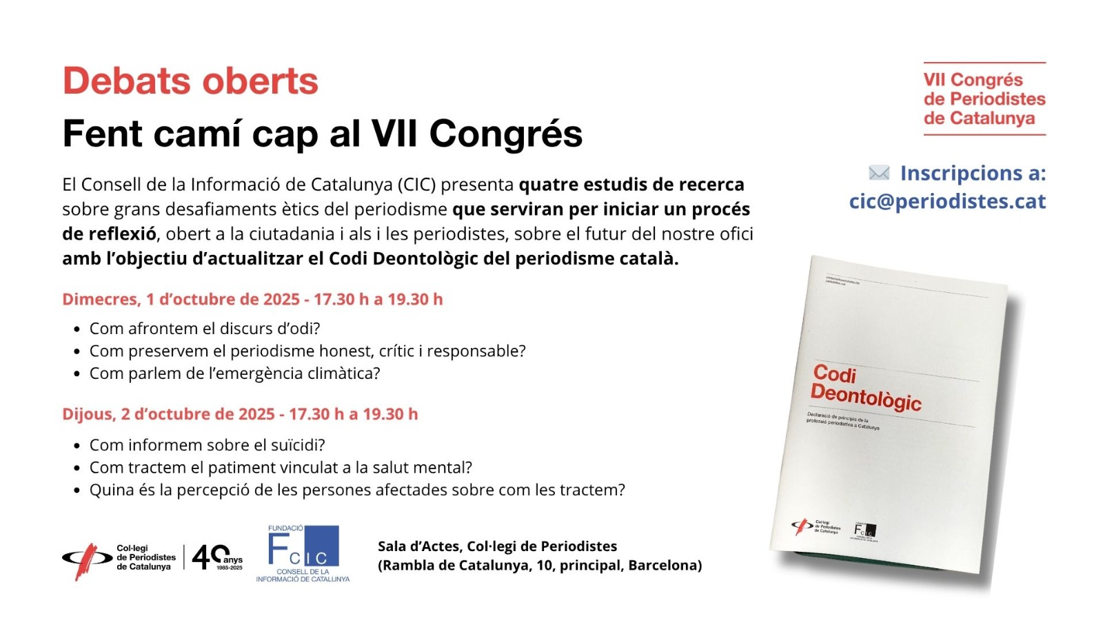 El Consell de la Informació de Catalunya (CIC), juntament amb el Col·legi de Periodistes de Catalunya, presentarà els dies 1 i 2 d’octubre a les 17.30 h quatre estudis centrats en els principals desafiaments ètics del periodisme actual. Ambdós debats, que tindran lloc a la Sala d’Actes de la seu de Barcelona del Col·legi, estan oberts tant a professionals com a la ciutadania, amb l’objectiu d’iniciar una reflexió conjunta que permeti l’actualització del Codi Deontològic del periodisme català.