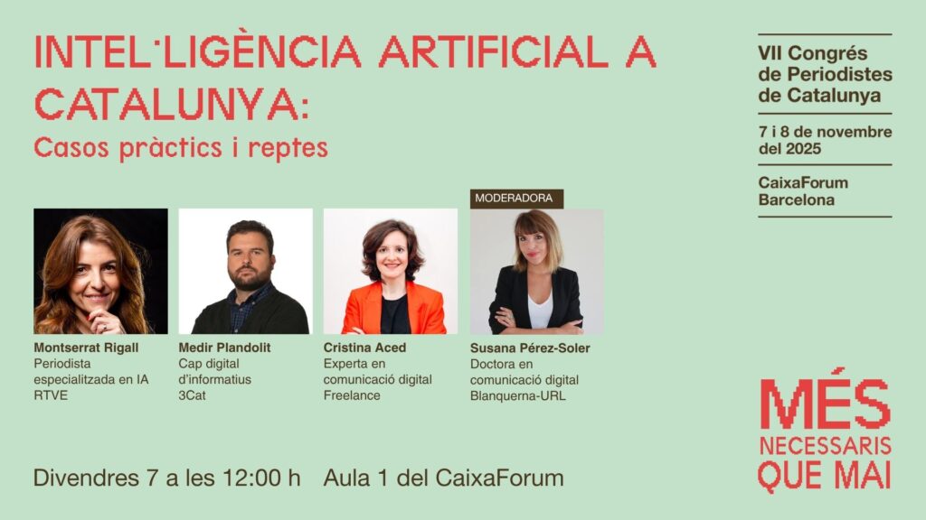 Periodistes de mitjans i comunicació corporativa comparteixen experiències i exemples d’ús de la intel·ligència artificial en la pràctica periodística. Descobrirem com aquesta tecnologia s’aplica avui per optimitzar processos, generar continguts i afrontar nous reptes professionals. (Taula rodona)